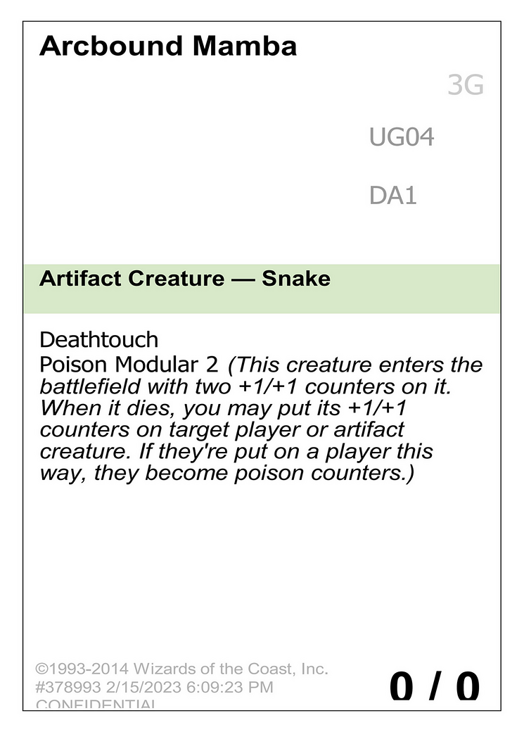 Poison Modular 2 (This creature enters the battlefield with two +1/+1 counters on it. When it dies, you may put its +1/+1 counters on target player or artifact creature. If they're put on a player this way, they become poison counters.)