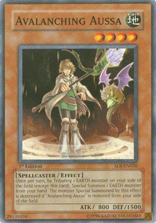 Once per turn, by Tributing 1 EARTH monster on your side of the field (except this card), Special Summon 1 EARTH monster from your hand. The monster Special Summoned by this effect is destroyed if "Avalanching Aussa" is removed from your side of the field.