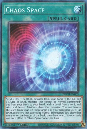 Send 1 LIGHT or DARK monster from your hand to the GY; add 1 LIGHT or DARK monster that cannot be Normal Summoned/Set from your Deck to your hand, with a Level from 4 to 8, and with a different Attribute than that monster. You can banish this card from your GY, then target 1 of your banished LIGHT or DARK monsters that cannot be Normal Summoned/Set; place that monster on the bottom of the deck, then draw 1 card. You can only use each effects of "Chaos Space" once per turn.