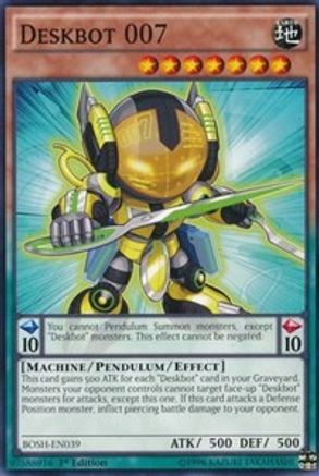 Pendulum Effect: You cannot Pendulum Summon monsters, except "Deskbot" monsters. This effect cannot be negated.