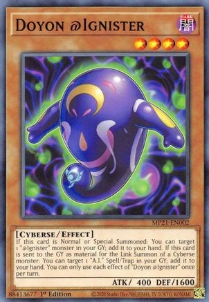If this card is Normal or Special Summoned: You can target 1 "@Ignister" monster in your GY; add it to your hand. If this card is sent to the GY as material for the Link Summon of a Cyberse monster: You can target 1 "A.I." Spell/Trap in your GY; add it to your hand. You can only use each effect of "Doyon @Ignister" once per turn.