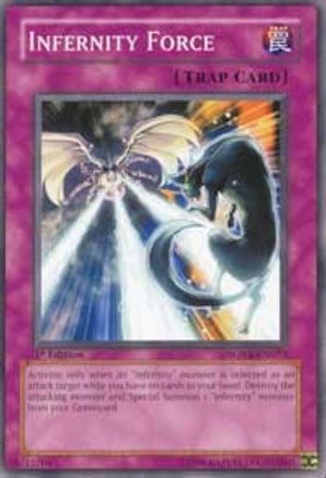 This card can only be activated when there are no cards in your hand and an Infernity monster is selected as an attack target. Destroy the attacking monster and select 1 Infernity monster in your Graveyard and Special Summon it.