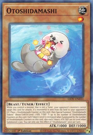 While you control a monster that is not a Tuner, your opponent's monsters cannot target this card for attacks. If a monster(s) is sent from the field to your opponent's GY: Place 1 Otoshidamashi Counter on this card, then Special Summon "Otoshidamashi Tokens" (Beast/EARTH/Level 1/ATK ?/DEF ?) up to the number of Otoshidamashi Counters on this card. Each Token's Level is increased when Summoned by the number of Otoshidamashi Counters on this card, also each Token's ATK/DEF are its Level when Summoned x 500. You can only use this effect of "Otoshidamashi" once per turn.