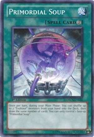 Once per turn, during your Main Phase: You can shuffle up to 2 "Evolsaur" monsters from your hand into the Deck, then draw the same number of cards. You can only control 1 face-up "Primordial Soup".
