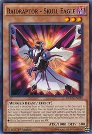 If this card is detached from an Xyz Monster and sent to the Graveyard to activate that monster's effect: You can banish this card from your Graveyard, then target 1 "Raidraptor" card in your Graveyard; add it to your hand. You can only use this effect of "Raidraptor - Skull Eagle" once per turn. An Xyz Monster that was Summoned using this card on the field as Xyz Material gains this effect.