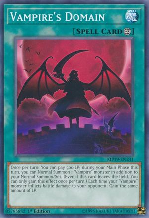 Once per turn: You can pay 500 LP; during your Main Phase this turn, you can Normal Summon 1 "Vampire" monster in addition to your Normal Summon/Set. (Even if this card leaves the field. You can only gain this effect once per turn.) Each time your "Vampire" monster inflicts battle damage to your opponent: Gain the same amount of LP.